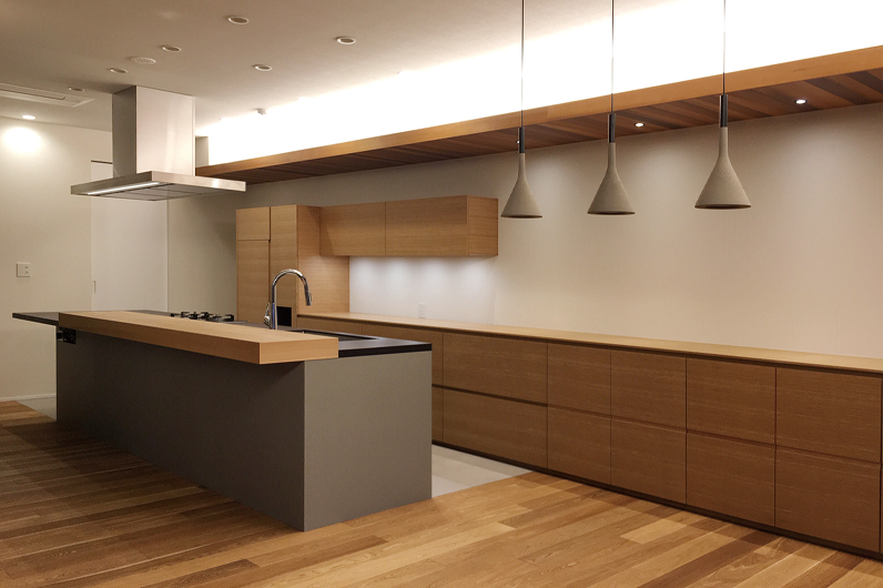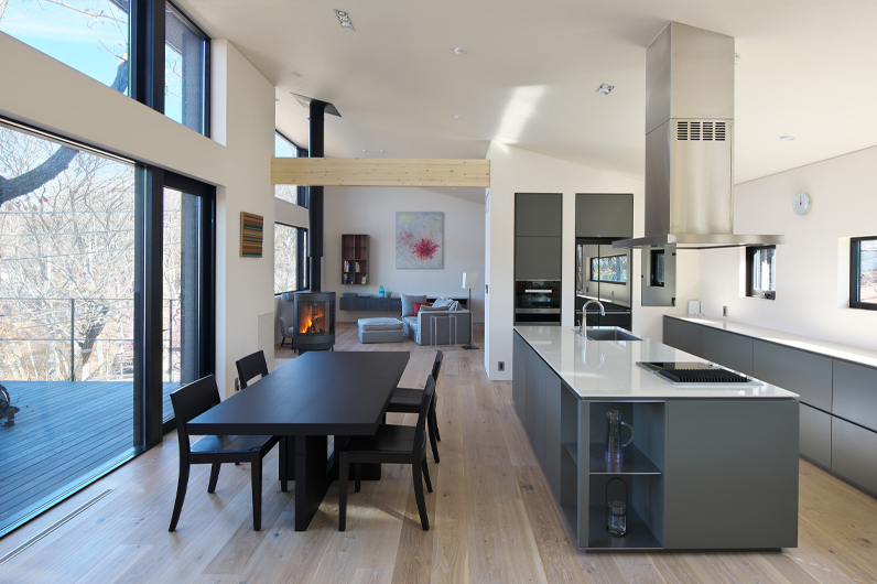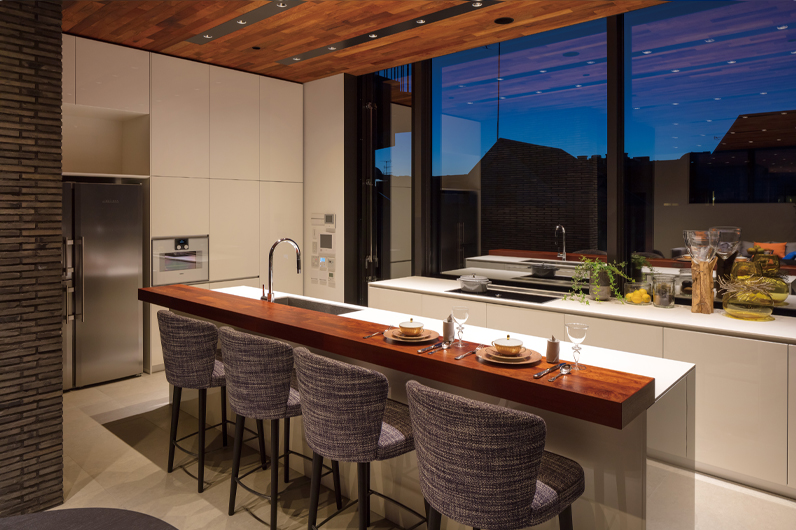 The island-type kitchen, inspired by the word “ISLAND,” features a sink and worktop positioned away from the walls, allowing access from both sides. This layout offers excellent workflow efficiency and enables comfortable face-to-face interaction with family or guests in the dining and living areas — one of the key advantages of a modern island kitchen.