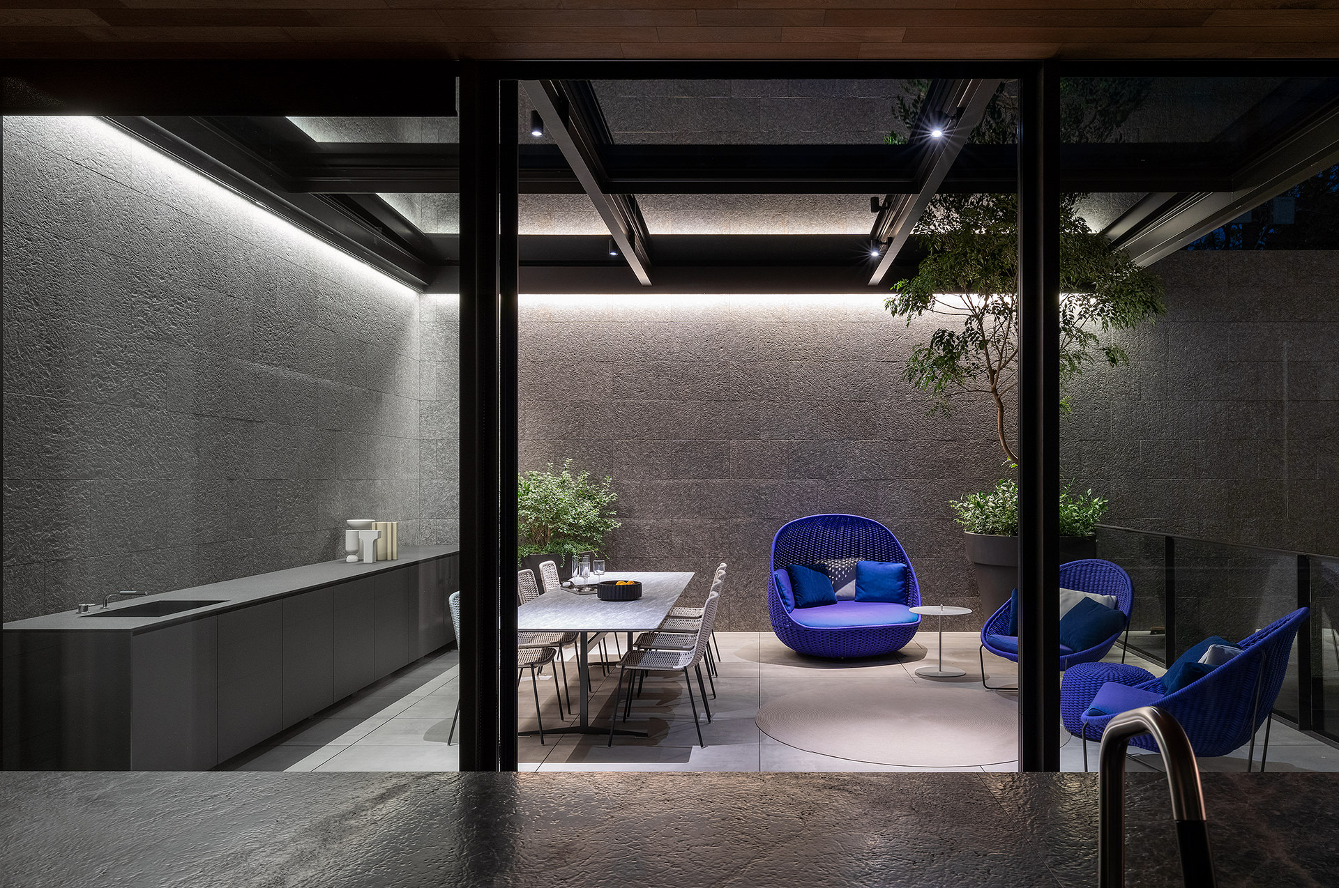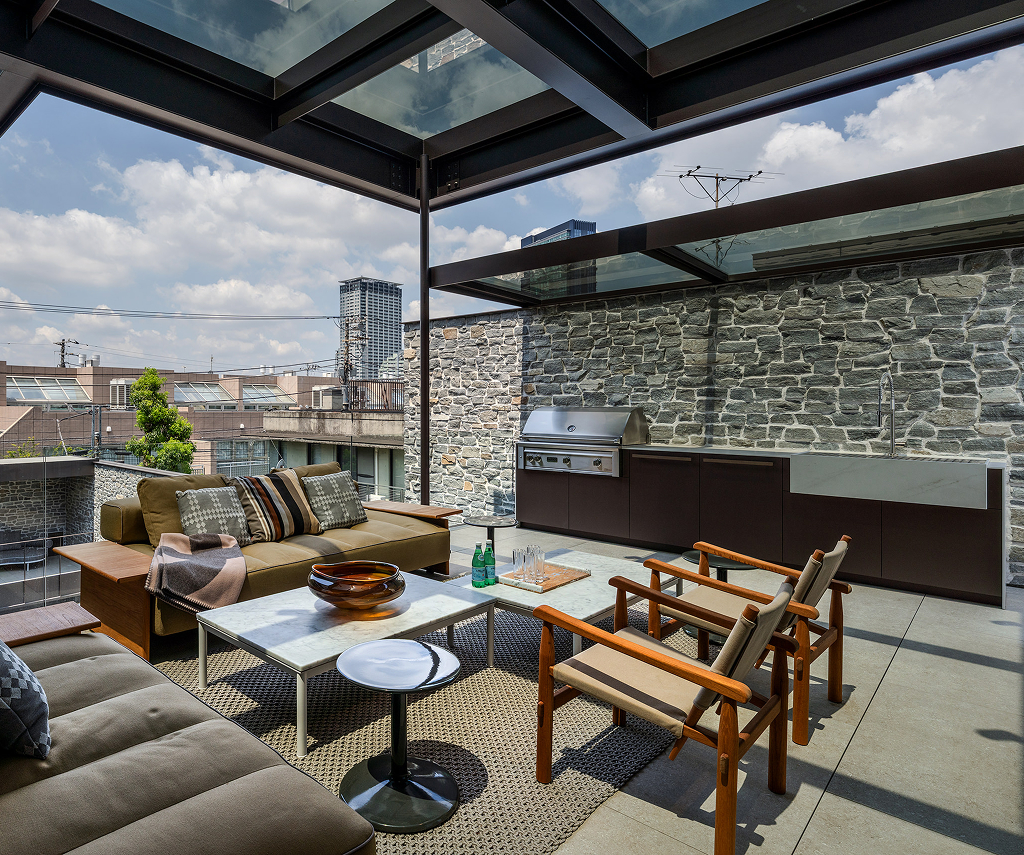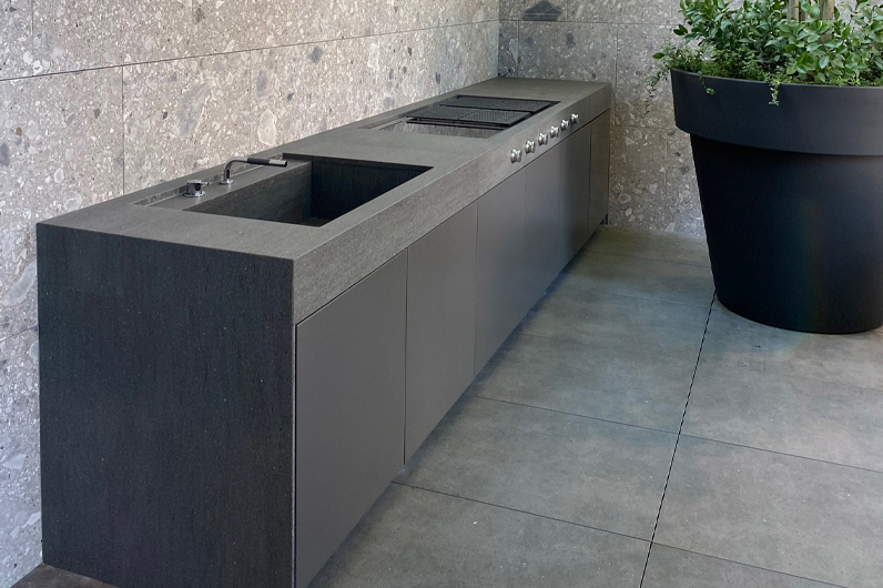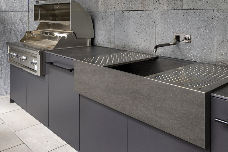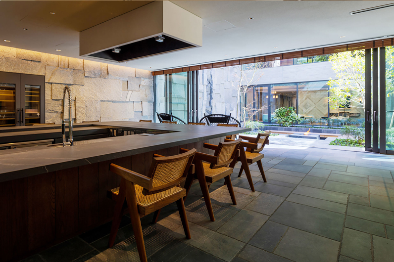 An outdoor kitchen designed in harmony with the interior space becomes a stage that transforms moments spent outside into extraordinary experiences.