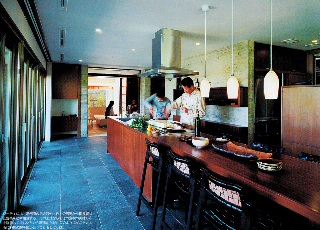 パーティーには湯河原の魚介類や、近くの農家から取り寄せた野菜を必ず用意する。その土地ならではの食材の美味しさを堪能して欲しいという配慮からだ。このようにゲストとともに料理の腕を競いあうキッチンスタイル。