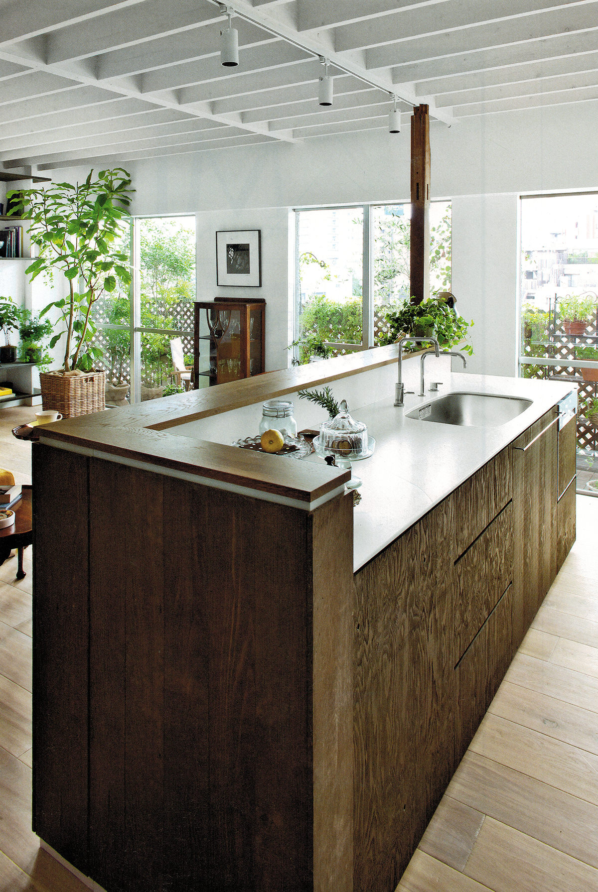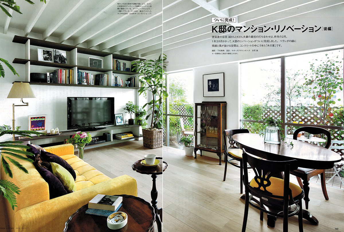 建築家の谷尻誠さんとKさんご夫妻の最初の打ち合わせは2011年2月。1年3ヶ月かかってK邸のリノベーションがついに完成しました。ベランダの緑に視線と風が抜ける空間は、コンクリートの中にできた「木の家」です。