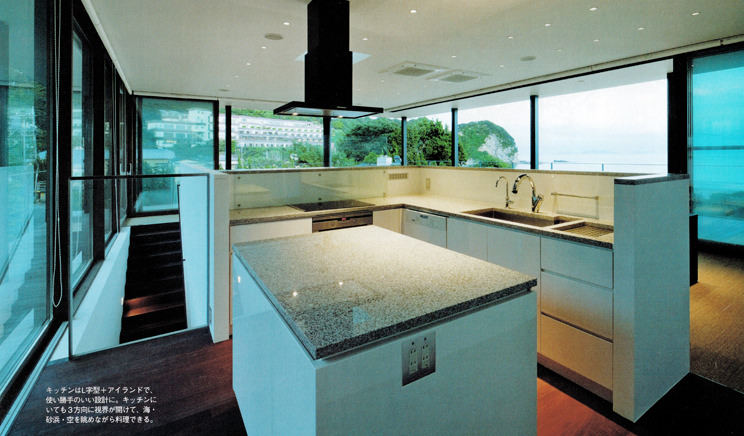 キッチンはL字型+アイランドで、使い勝手のいい設計に。キッチンについても3方向に視界が開けて、海・砂浜・空を眺めながら料理できる。