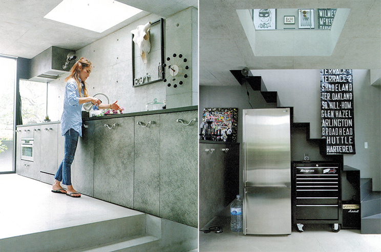 コーポラティブマンションで住まいを新築することになった施主。錆びたようなラスティックな質感のキッチンは、予算と重量の問題に配慮し、「ステンレススチールエイジング仕上げ」と言うポーターズペイントの塗料を使用し塗装仕上げ。壁際に沿ってすっとのびた直線的なキッチン。グリルのないシンプルなガスコンロの下に、コンパクトなドイツ製オーブン。特注したシャープなシンクの両側には幅60cmの食器洗い機とドラム式洗濯機がビルドインされ、日々の家事もスムーズにこなせるようになっている。