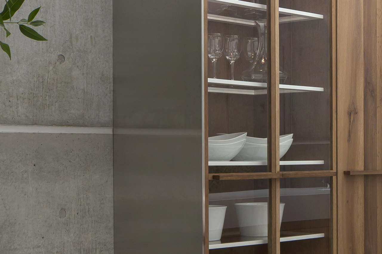 脚部や扉のフレームは、アルミにサーモオークの挽き板を巻いて強度を確保しつつ、木のシャープさを演出しています。